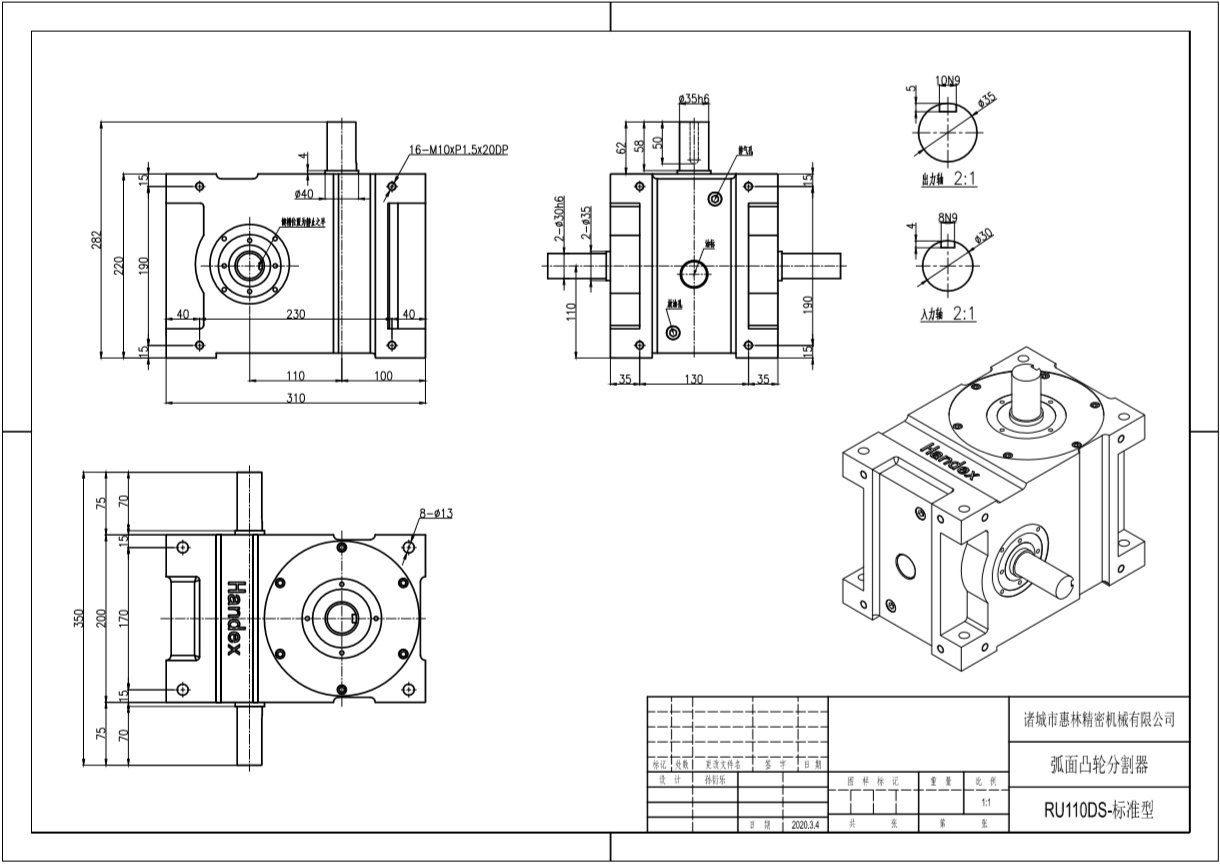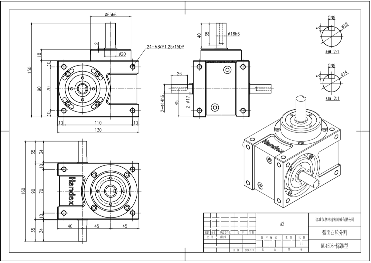 此系列機(jī)種為典型傳統(tǒng)式心軸造型,其在分割器上加工安裝配合齒輪、聯(lián)軸器或聯(lián)軸盤,需特別注重孔徑公差(+0.015/-0)、及鍵槽公差(+0.015/-0),其使用場合在輸送帶驅(qū)動(dòng)、齒輪驅(qū)動(dòng)、無間隙聯(lián)軸器結(jié)合驅(qū)動(dòng)居多。